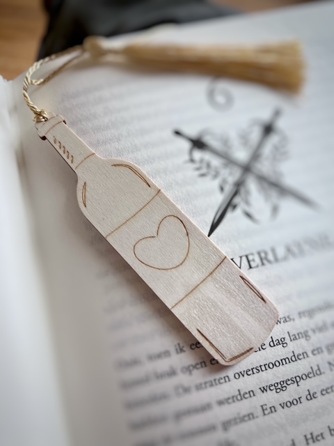 De boekenlegger heeft de vorm van een wijnfles met aan de ene kant een etiket met hartje en aan de andere kant de hilarische quote ‘I read between the wines’. Er hangt een gouden klosje aan het koordje zodat het makkelijk zichtbaar is als het tussen de bladzijden in je boek ligt.