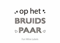 Wijnetiket ‘Op het bruidspaar’ is een ‘horizontaal’ wijnetiket, waardoor deze uitermate geschikt is voor een fles bubbels (Champagne, Cava of Prosecco). Leuk om te geven aan een bruidspaar of om tijdens je bruiloft bubbels te schenken. Gegarandeerd succes met onze wijnetiketten!
