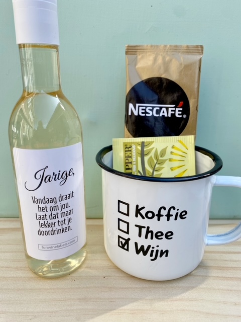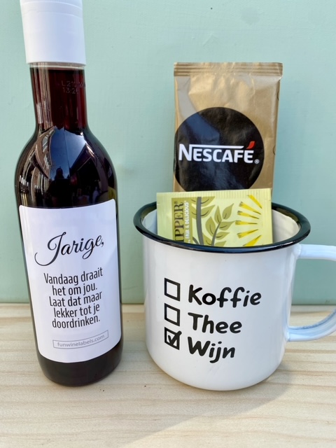 Vrolijk de jarige op dit jaar met een grappige box! Het bestaat uit een emaille mok met grappige wijn quote, koffie & thee zakje én een kleintje wijn met etiket naar keuze!